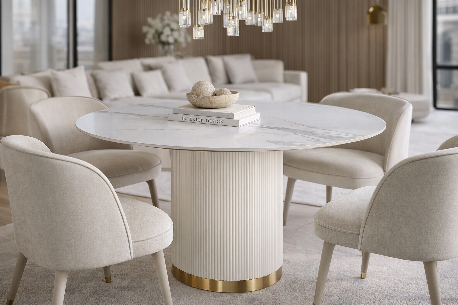 O masă de sufragerie modernă în alb ecru, cu un picior cilindric masiv din lemn canelat și o bază aurie. Blatul rotund alb imită marmura.