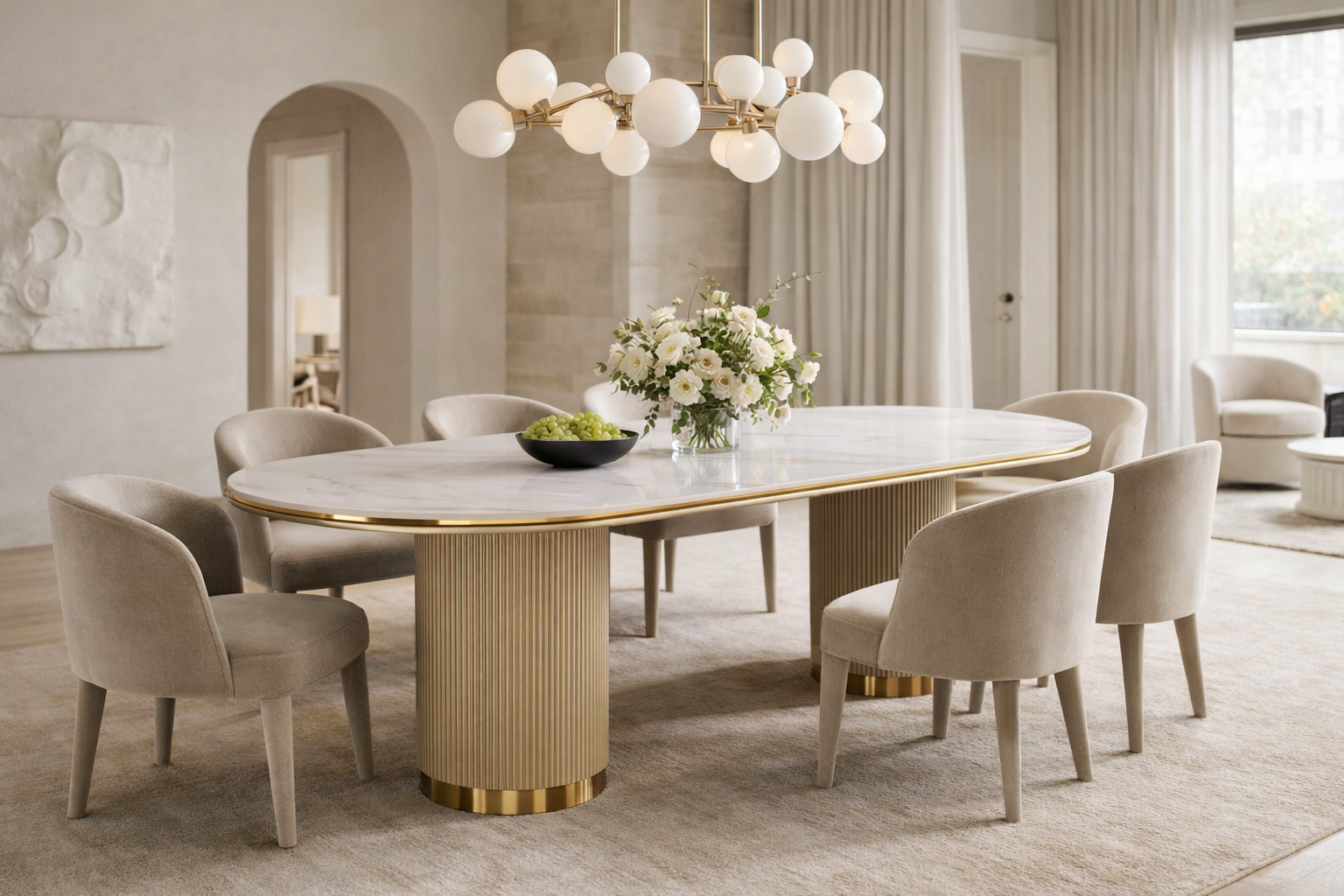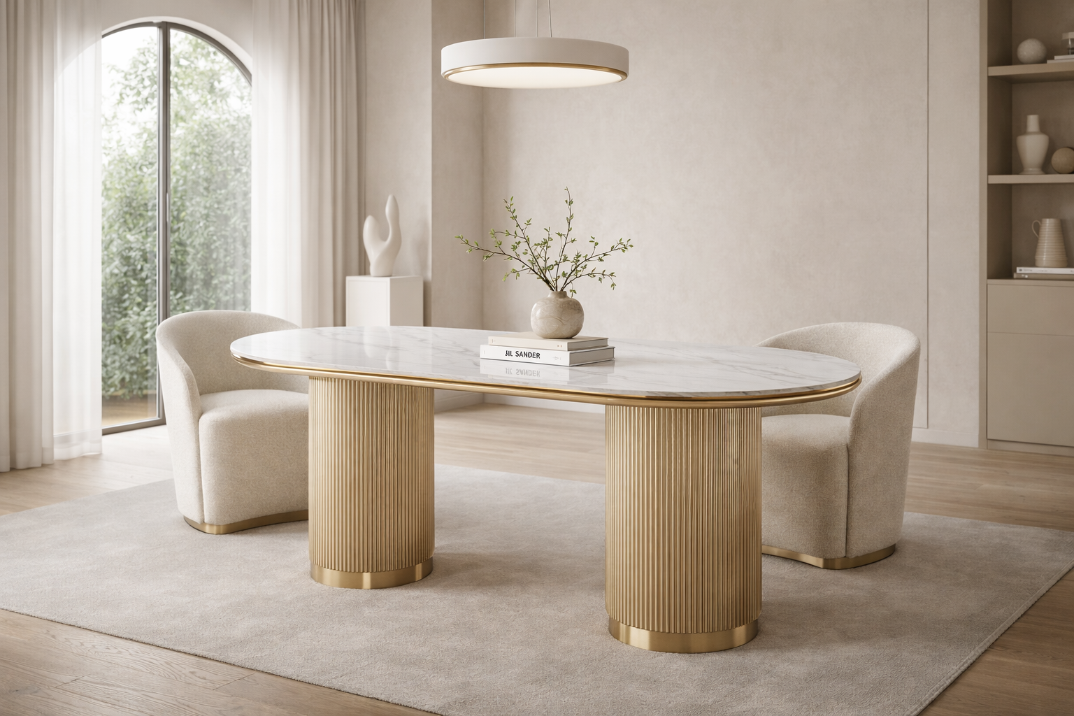 O masă modernă aurie, de culoarea șampaniei, cu picioare cilindrice masive din lemn canelat și o bază aurie deasupra. Blatul oval alb imită marmura.