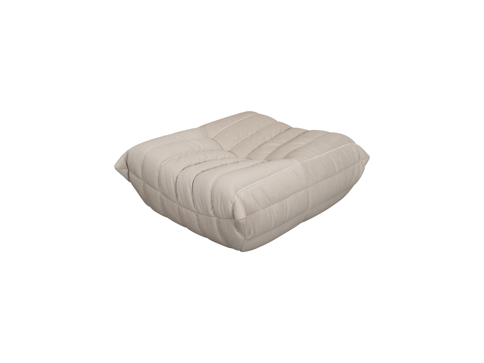 O canapea modernă și emblematică cu două locuri, cu o formă simplă și detalii sub formă de cusături orizontale cu o linie verticală centrală matlasată, de culoare bej, într-un set cu taburet.