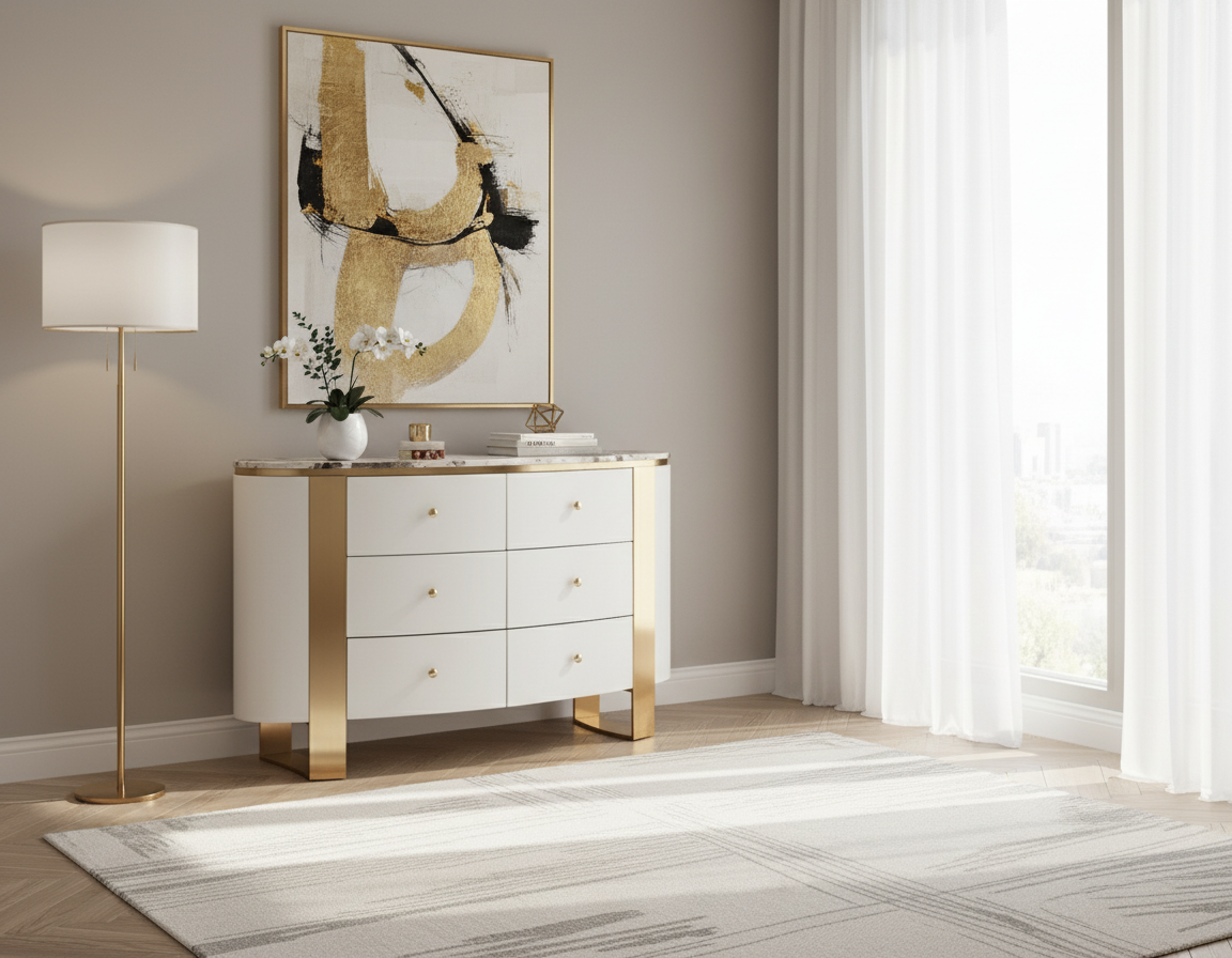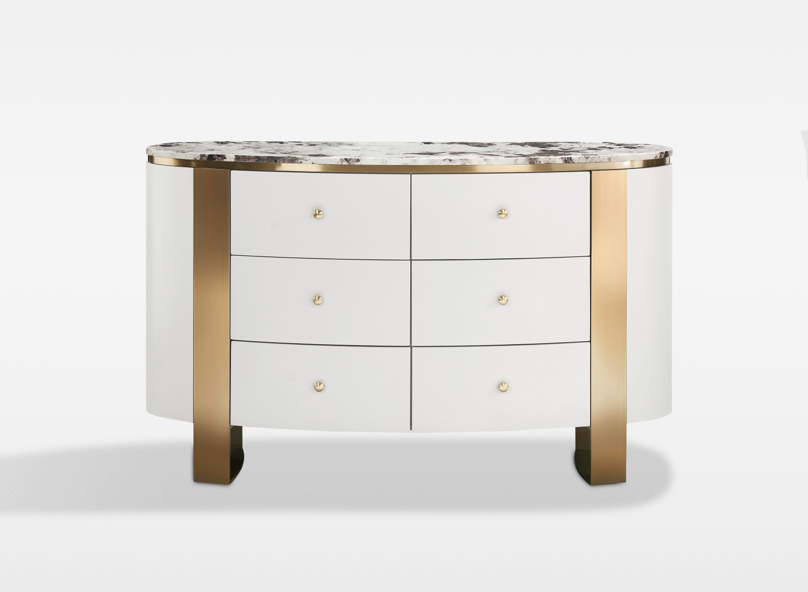 O comodă elegantă, ovală, de culoare alb-gălbui, cu accente aurii sub forma unei benzi sub blat și picioare care se conectează de-a lungul fronturilor la blatul de lucru, care are un finisaj din marmură.