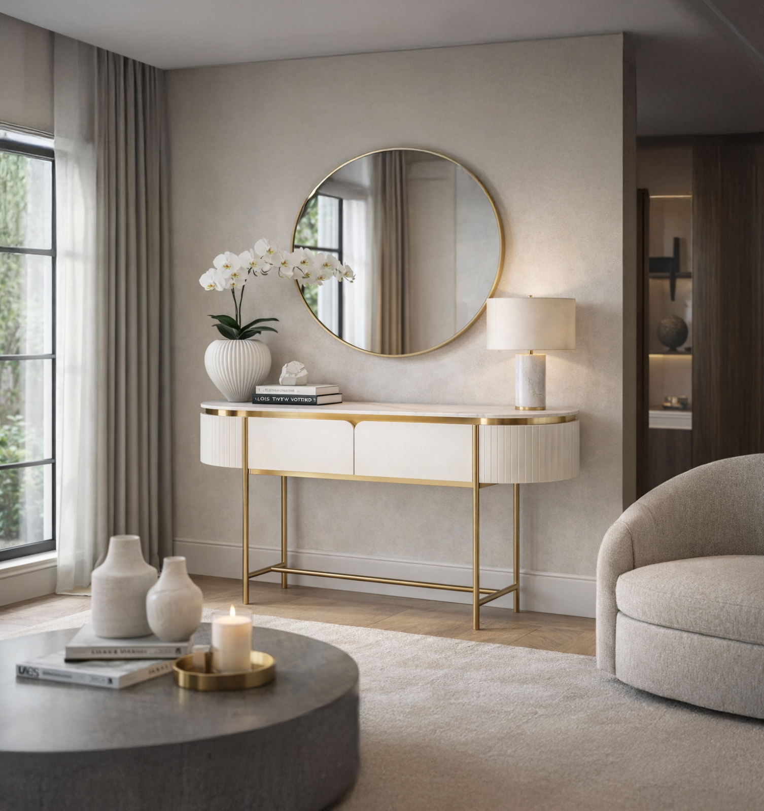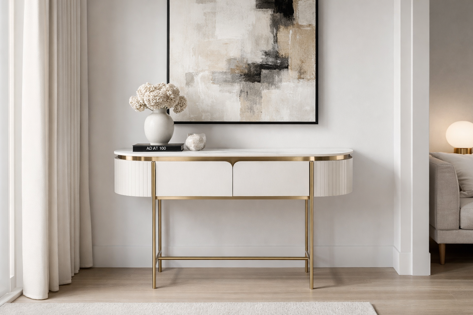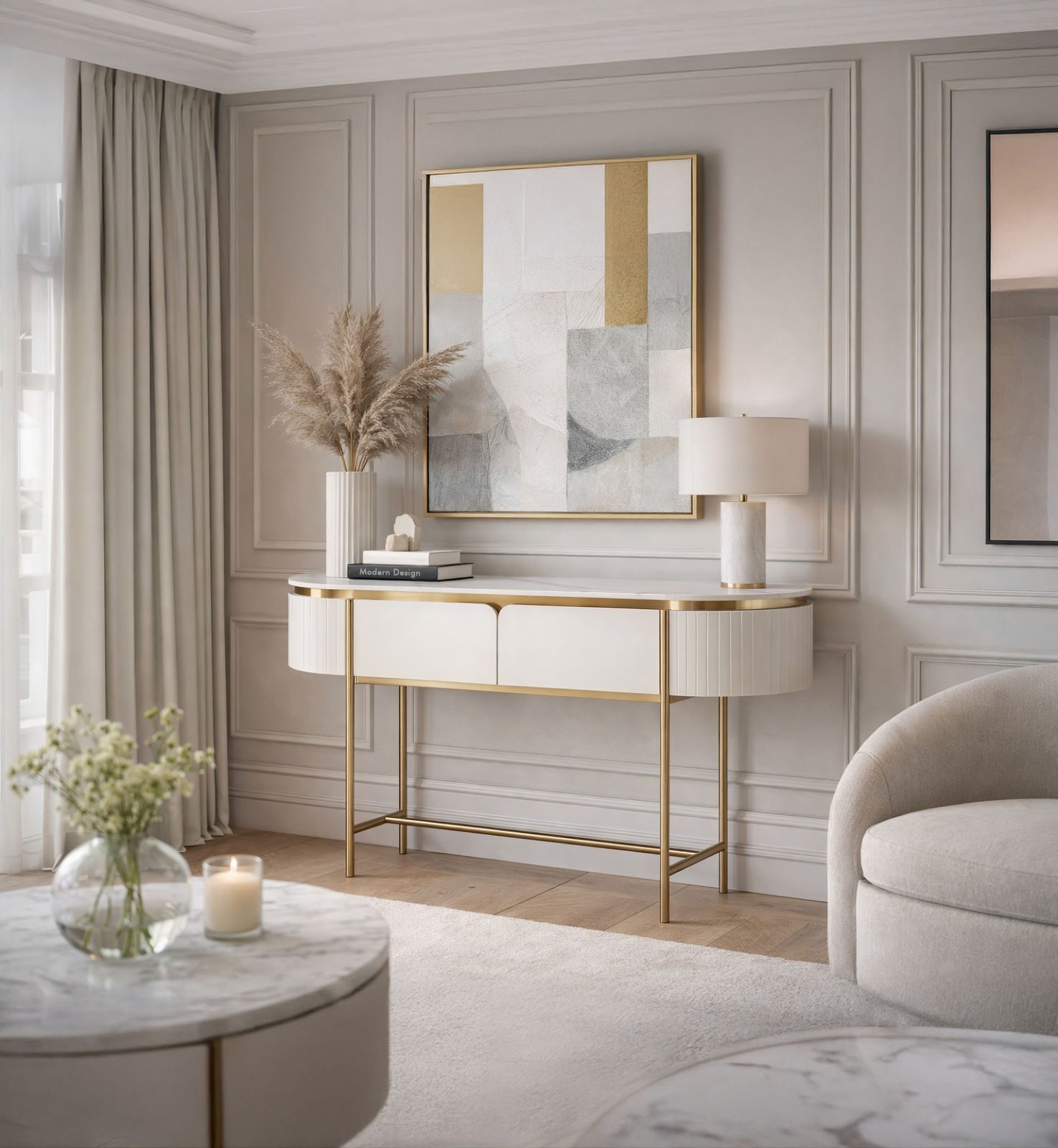 Stilig 124 este o consolă elegantă, de culoare alb-ecru, cu accente și picioare aurii. Cadrul are un finisaj din lemn canelat și un blat cu finisaj de marmură.