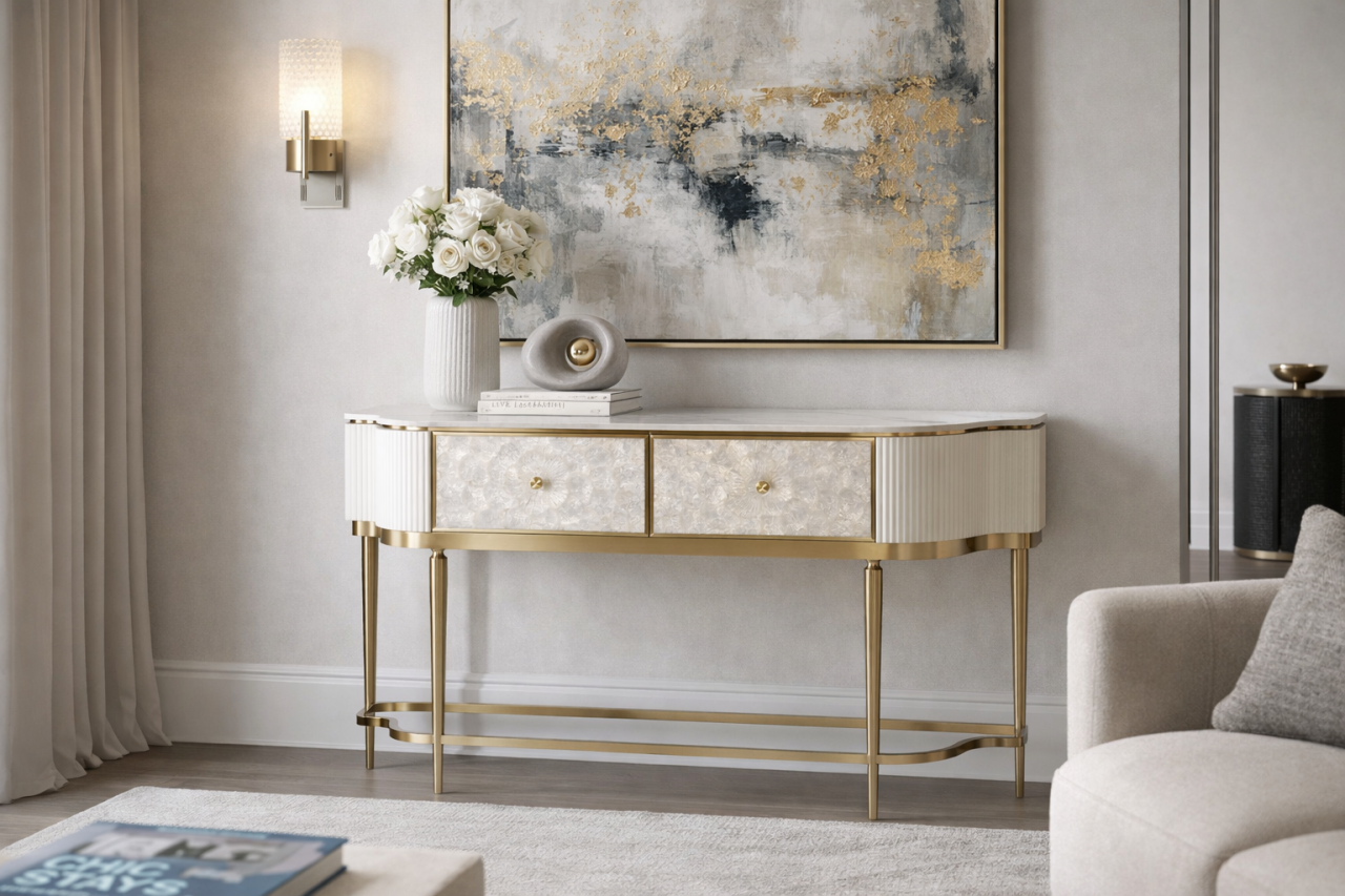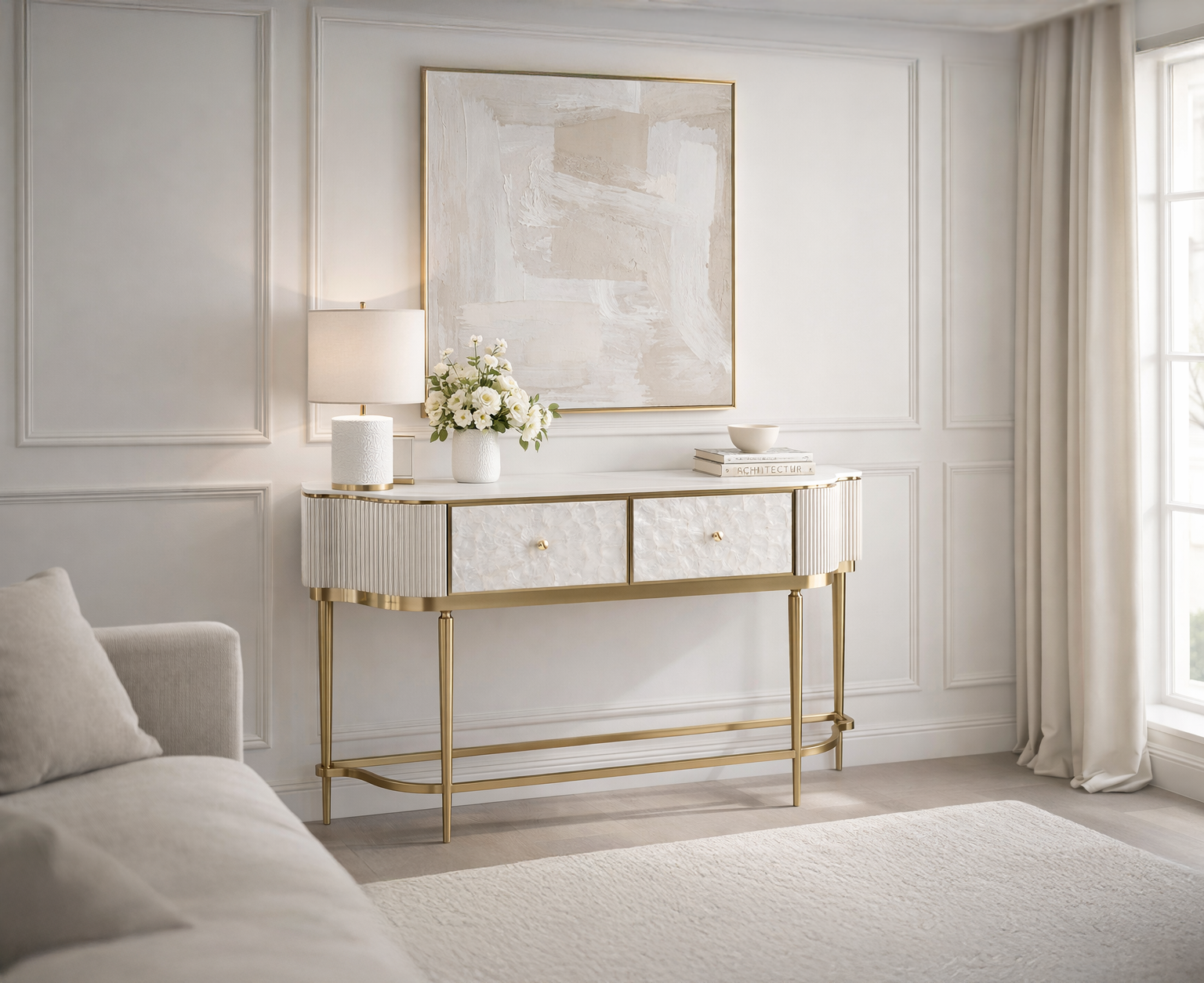 Stilig 904C, această masă consolă unică, de culoare alb-gălbui, are o față realizată din cochilie naturală, într-un model simetric. Corpul are lemn canelat și un blat cu finisaj de marmură.