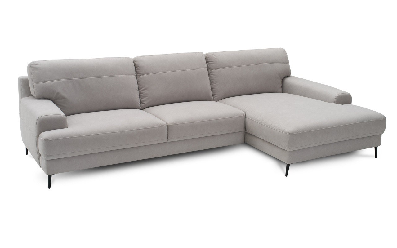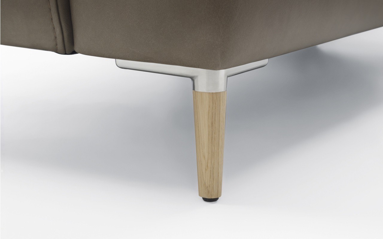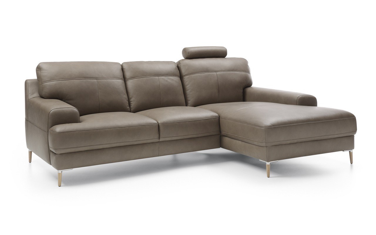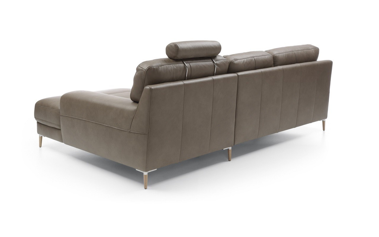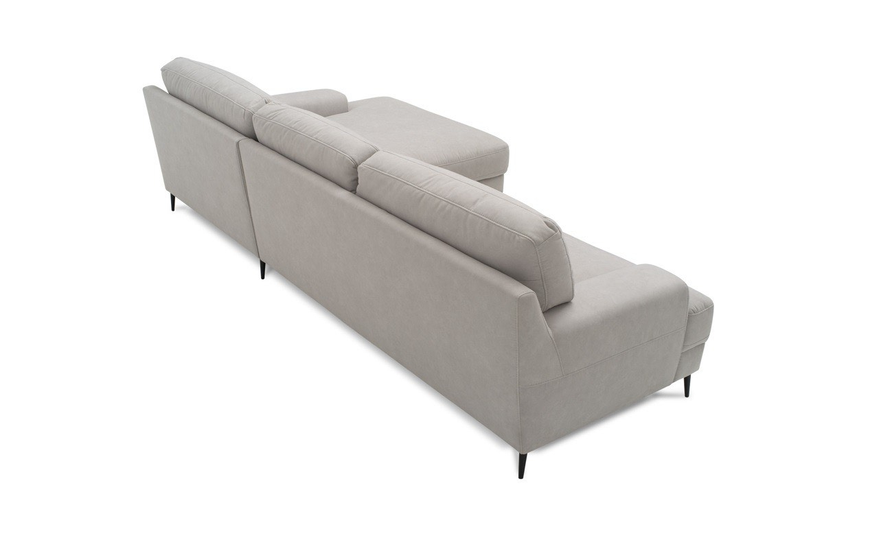 Arată la fel de spectaculos în tapițerie din piele și material textil. Puteți alege între două tipuri de picioare - din lemn sau cu finisaj mat negru metalic. Acest lucru vă permite să încorporați caracterul corpului de mobilier în designul interior al camerei. Picioarele înalte accentuează armonios forma puternică și distinctivă a acestei piese de mobilier. De asemenea, adaugă lejeritate și eleganță acestei canapele de colț și vă permit să curățați cu ușurință sub canapea folosind un aspirator automat.