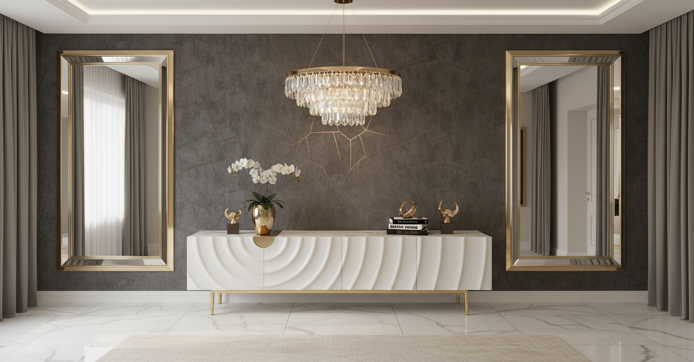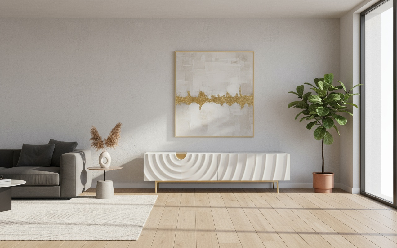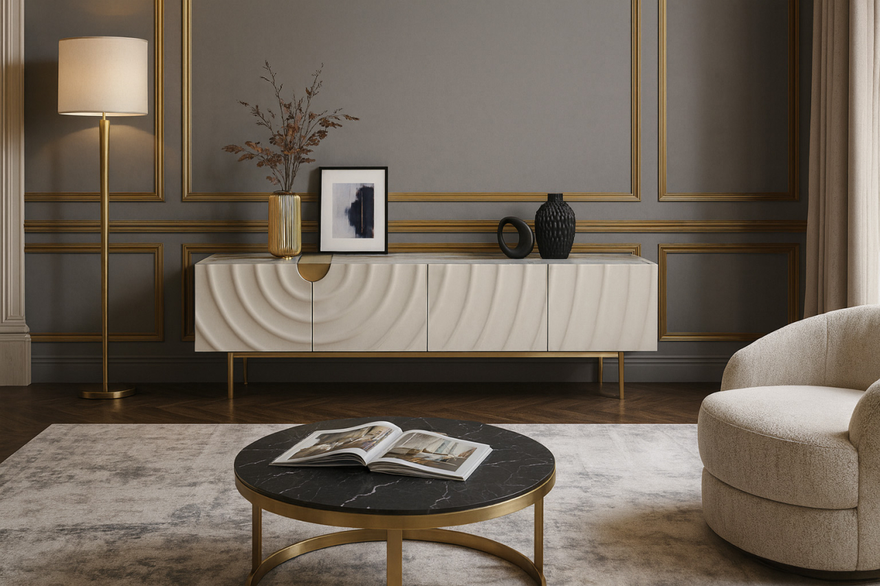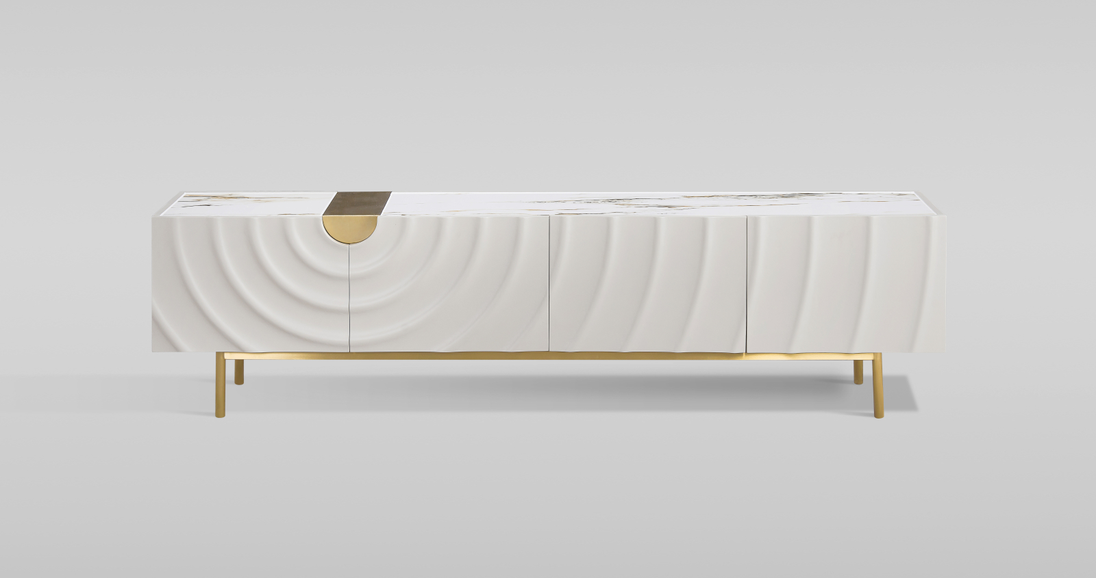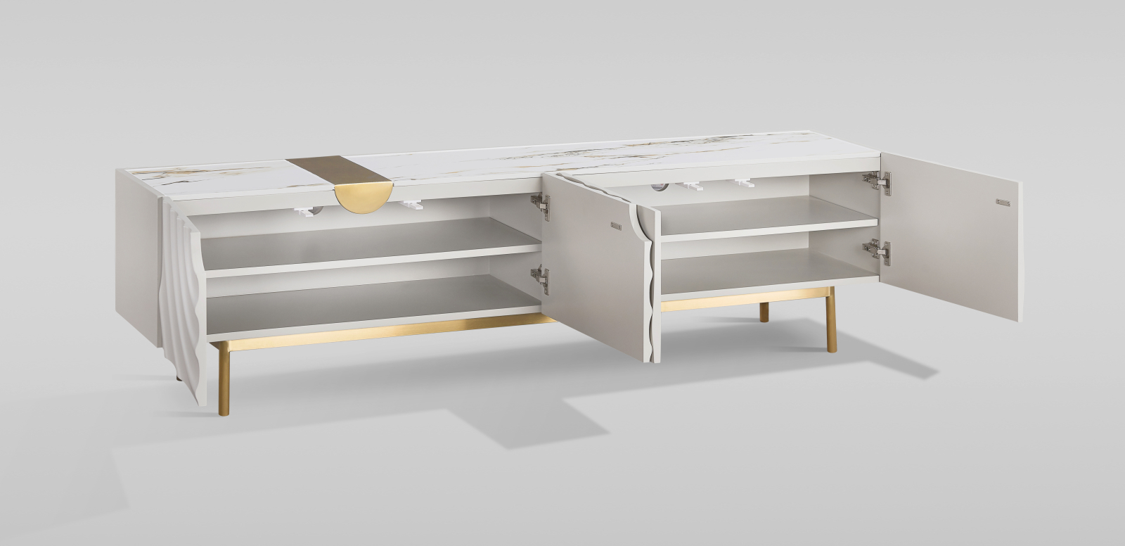 Această comodă TV alb-ecru, cu accente și picioare aurii, evocă stilul Art Deco. Fronturile ușilor sunt decorate cu cercuri concentrice în relief, cu un model central asimetric care se îmbină cu blatul cu finisaj marmorat.