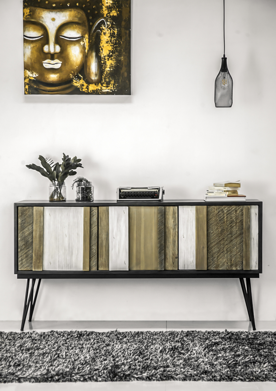 Comodă în stil retro cu diverse fronturi din lemn masiv în diferite nuanțe. Fronturile se bazează pe structura 3D și textura variată a suprafeței lemnului, de asemenea, sunt funcționale ca mânere de margine. Comoda are picioare metalice negre.
