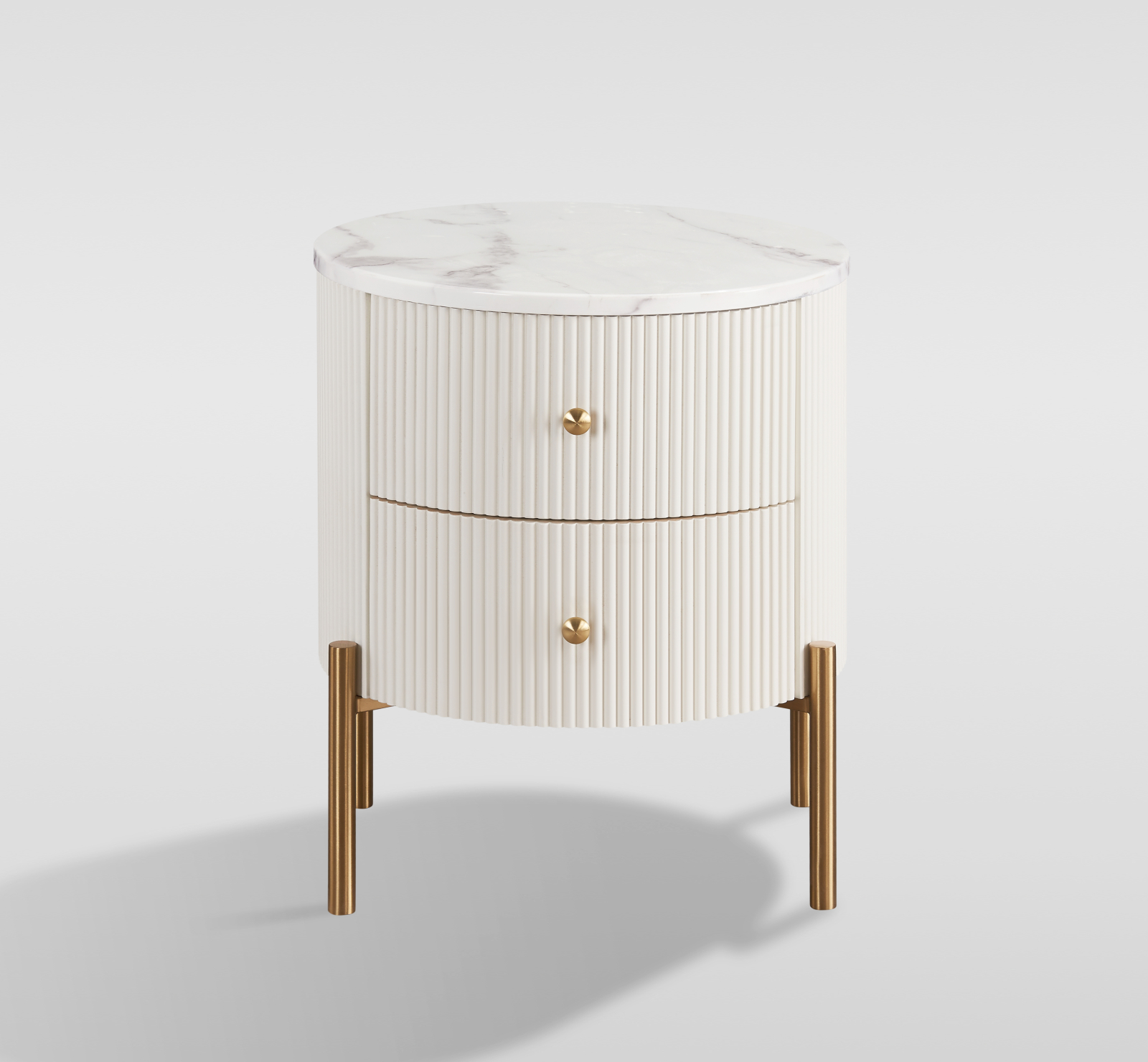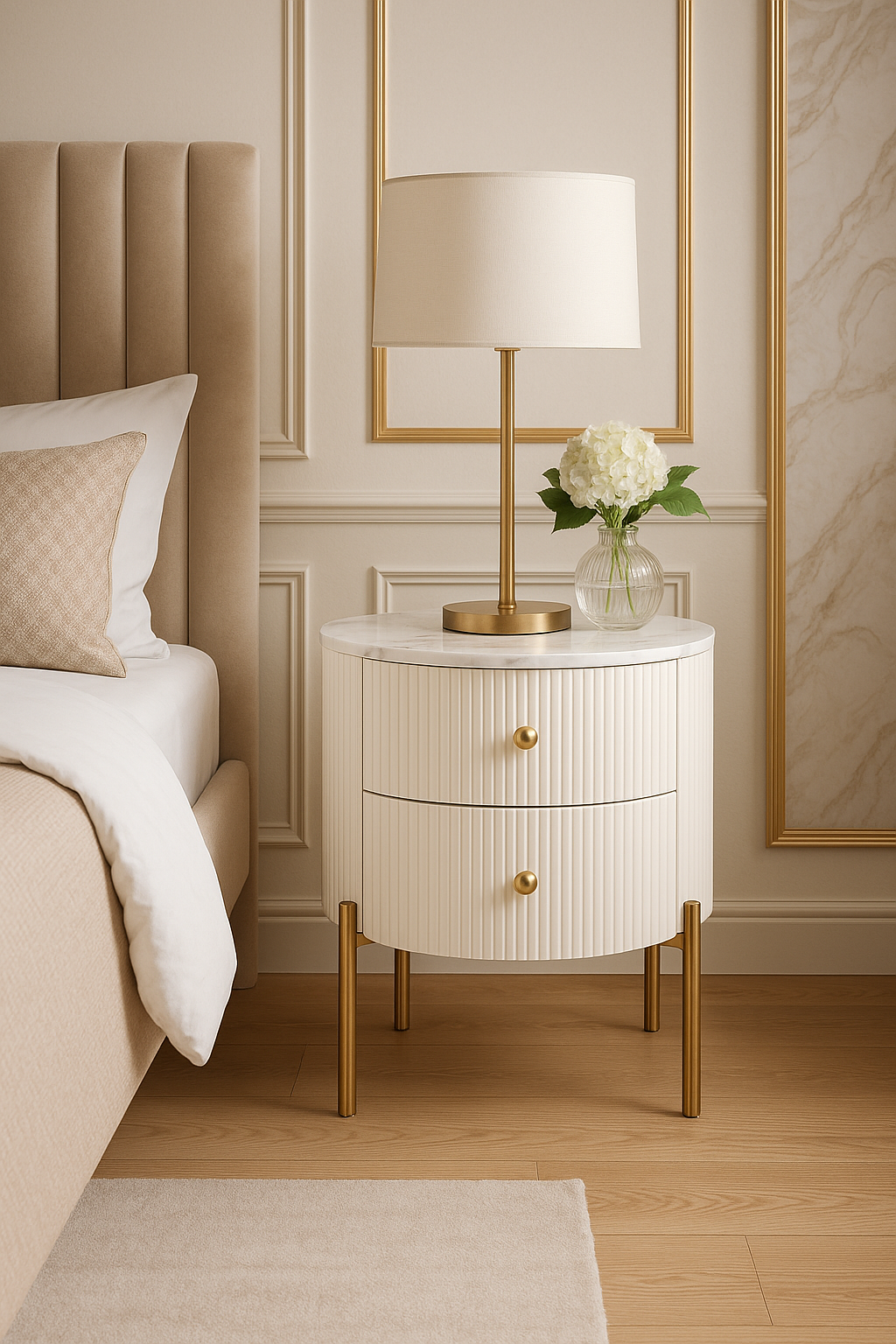 O noptieră elegantă în alb ecru cu accente și picioare aurii. Cadrul are un finisaj canelat din lemn și un blat cu finisaj de marmură.