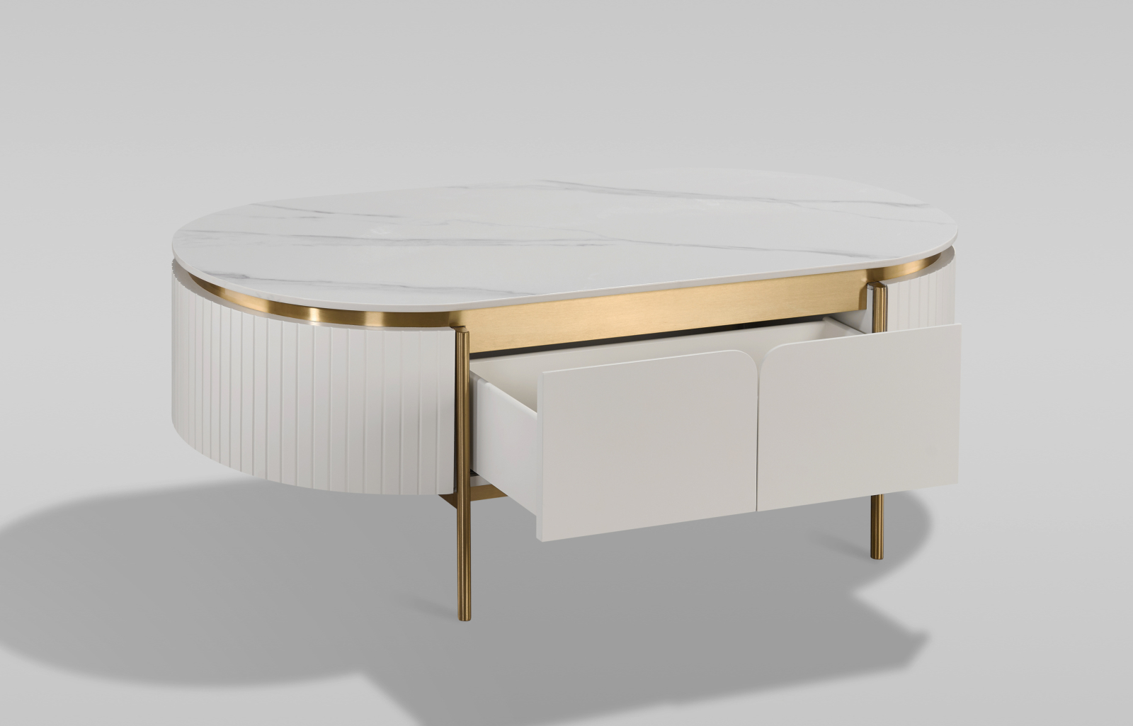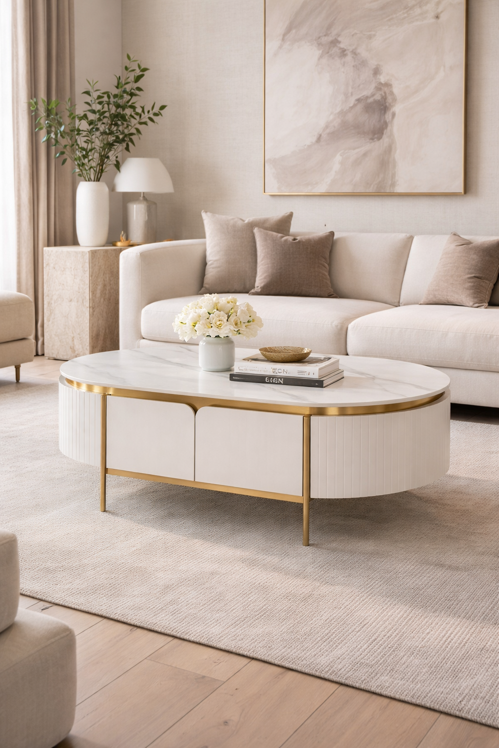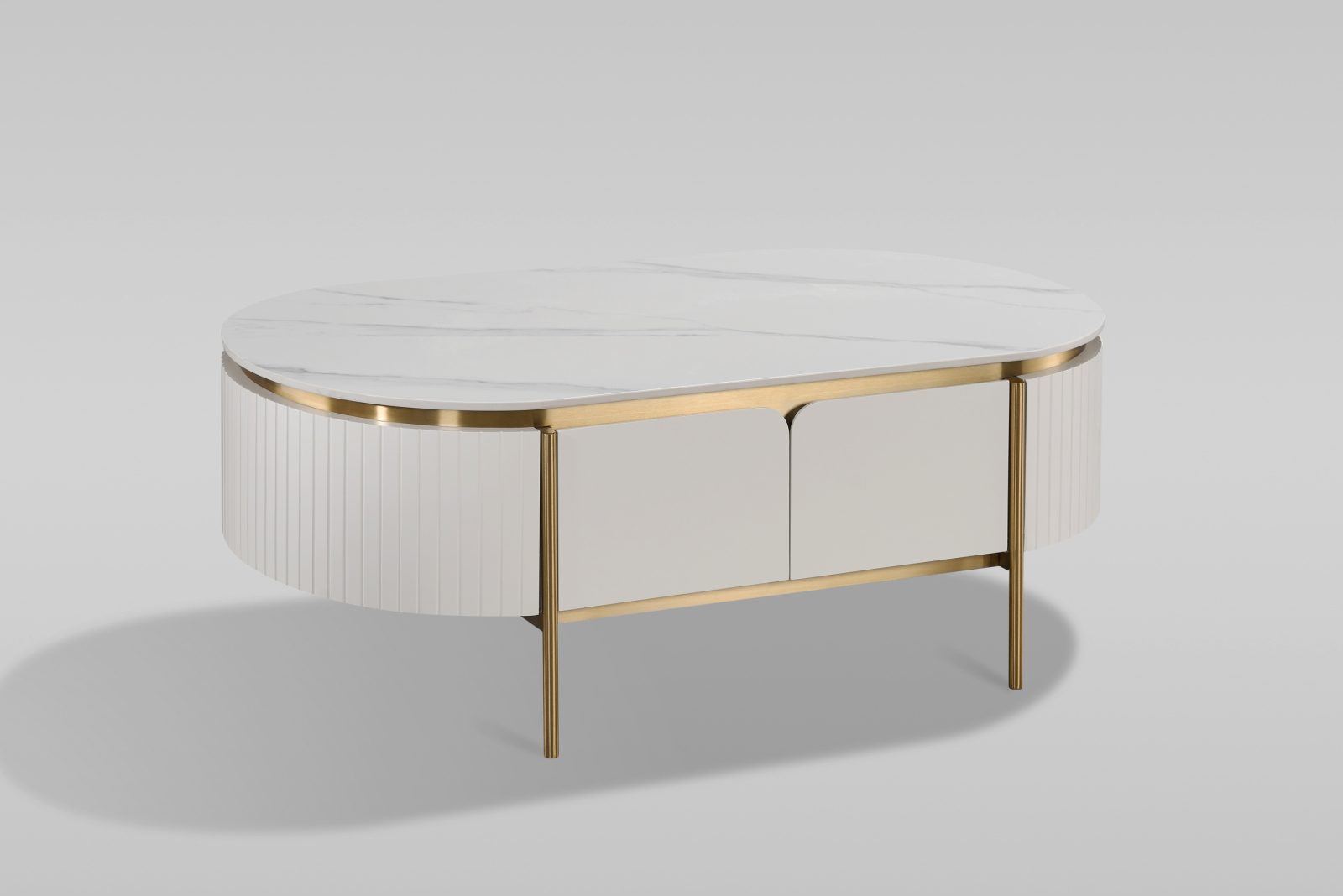 O măsuță de cafea elegantă, în alb ecru, cu accente și picioare aurii. Cadrul are un finisaj din lemn canelat și un blat cu finisaj de marmură.