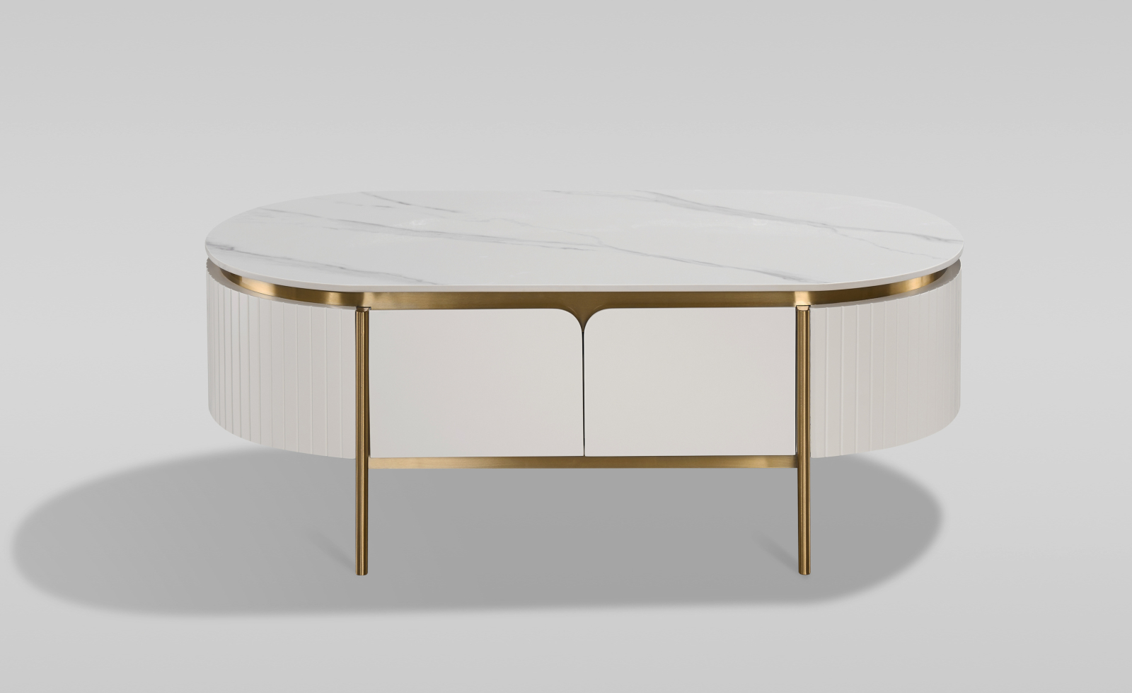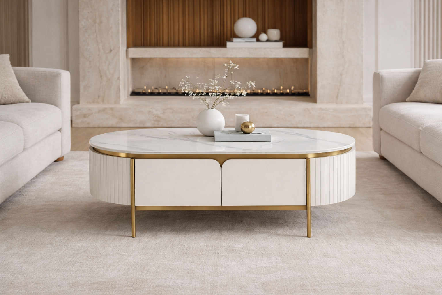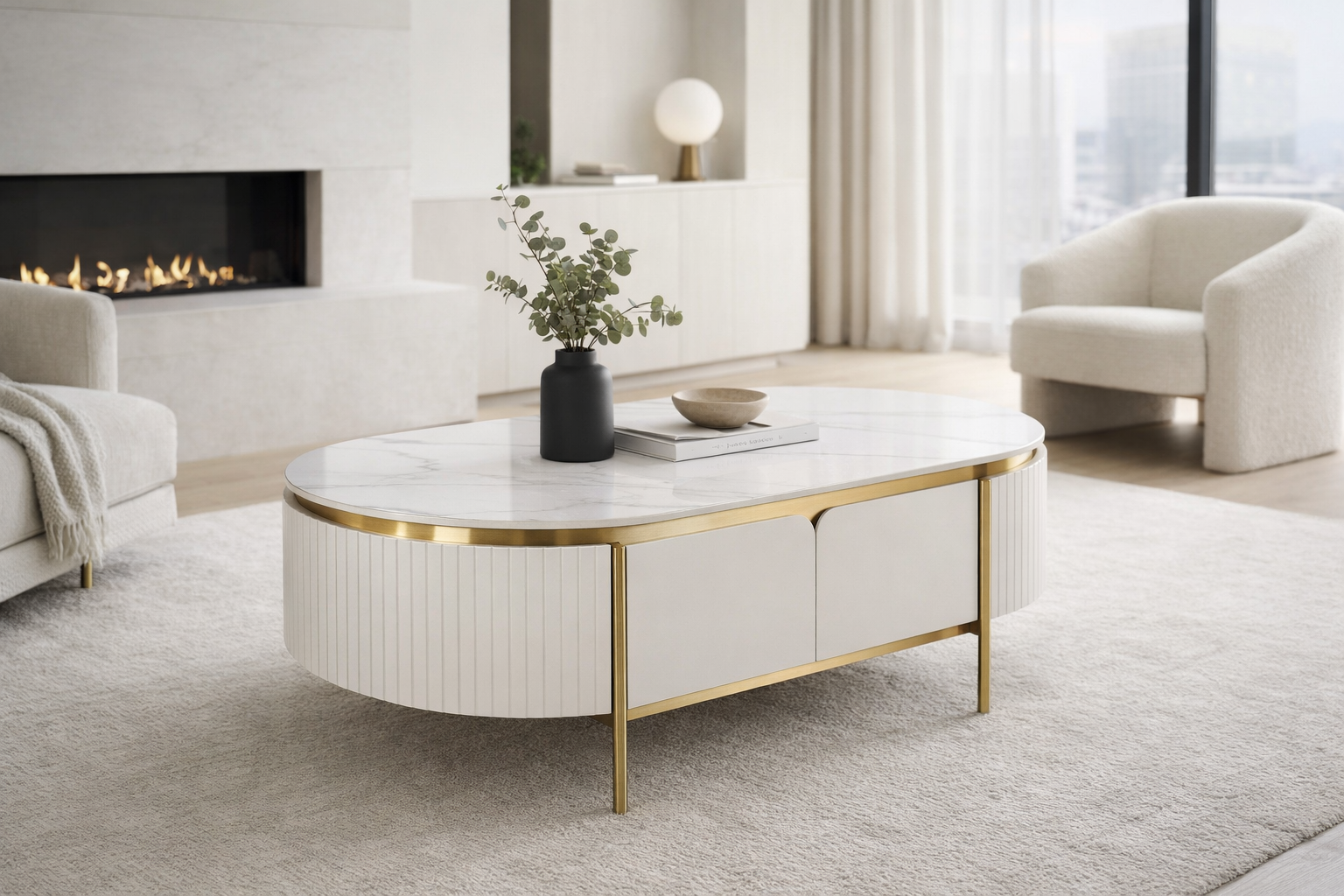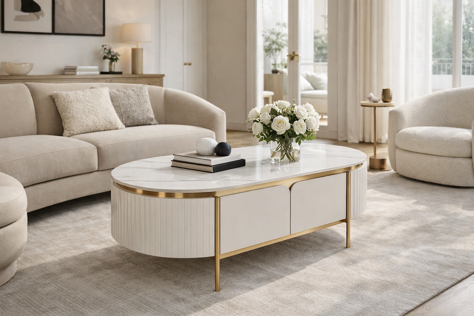 O măsuță de cafea elegantă, în alb ecru, cu accente și picioare aurii. Cadrul are un finisaj din lemn canelat și un blat cu finisaj de marmură.
