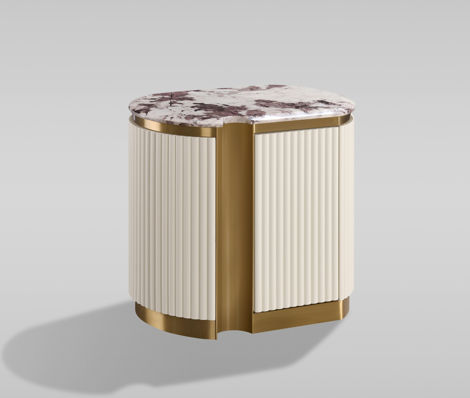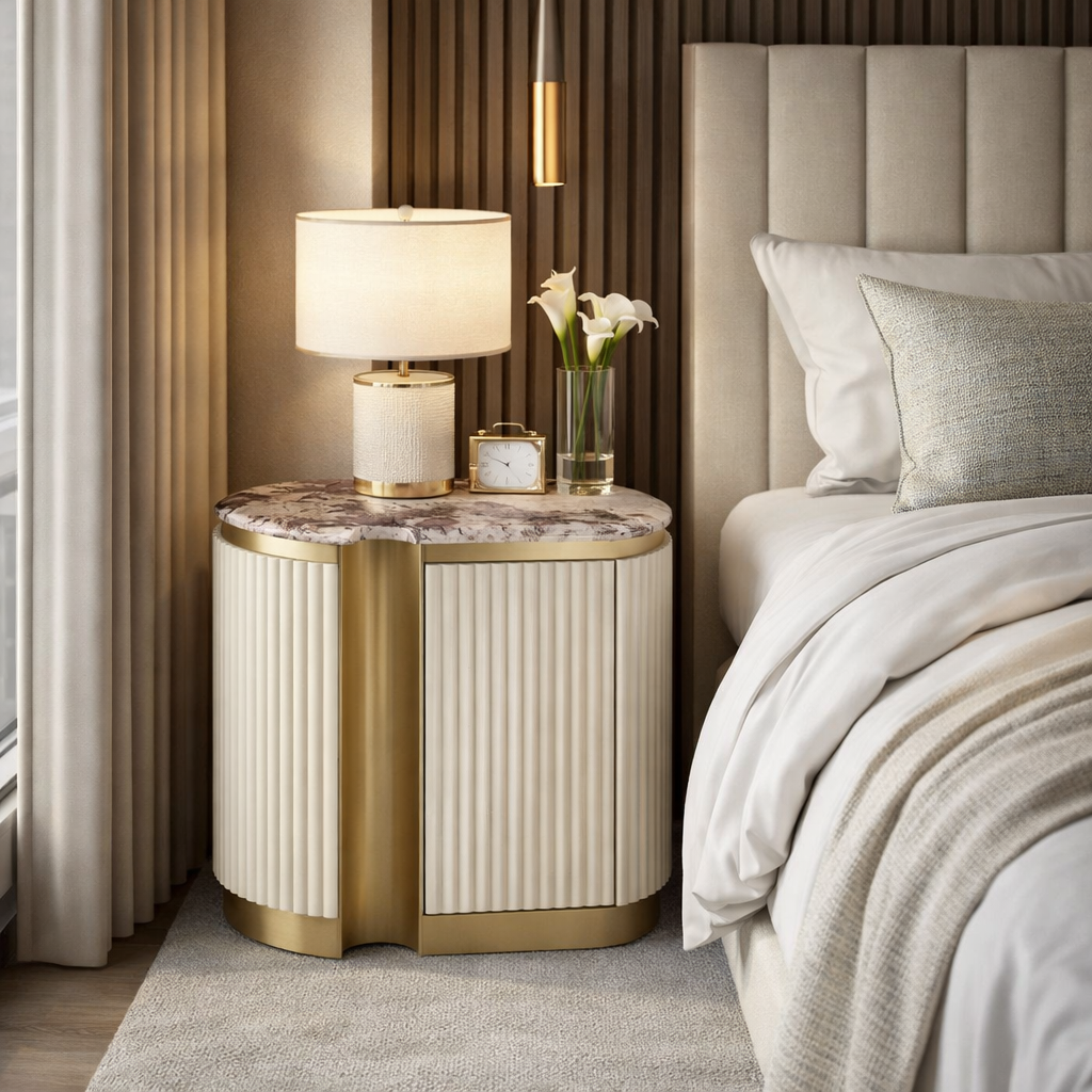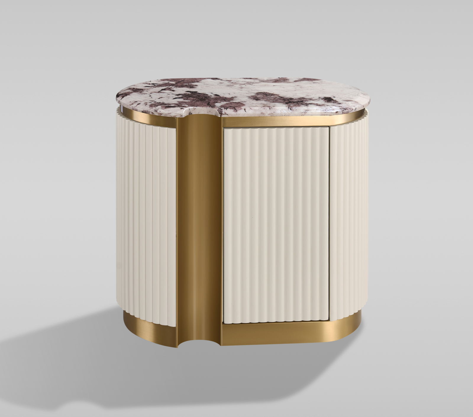 O noptieră elegantă, montată pe dreapta sau stanga, în culoarea alb ecru, cu accente aurii și o bază. Cadrul are un finisaj canelat din lemn. Blatul are un finisaj din marmură.