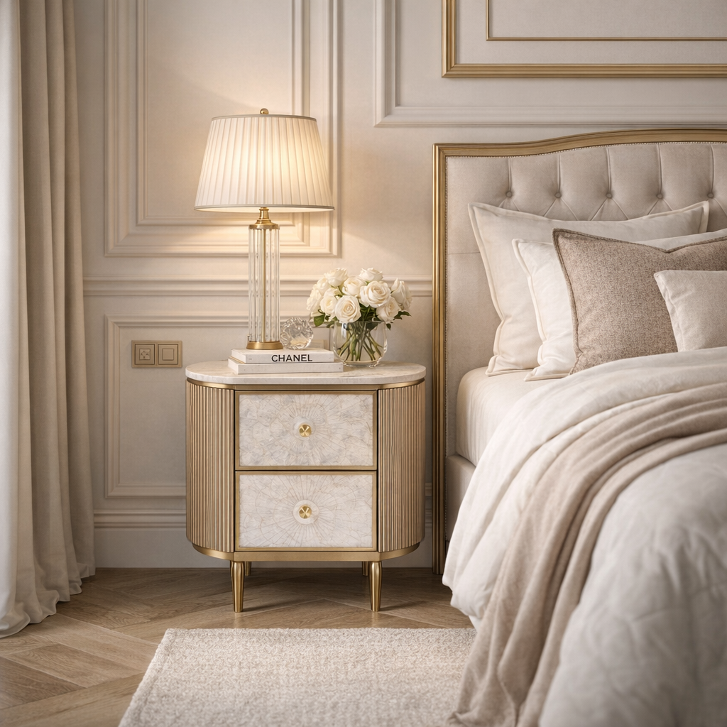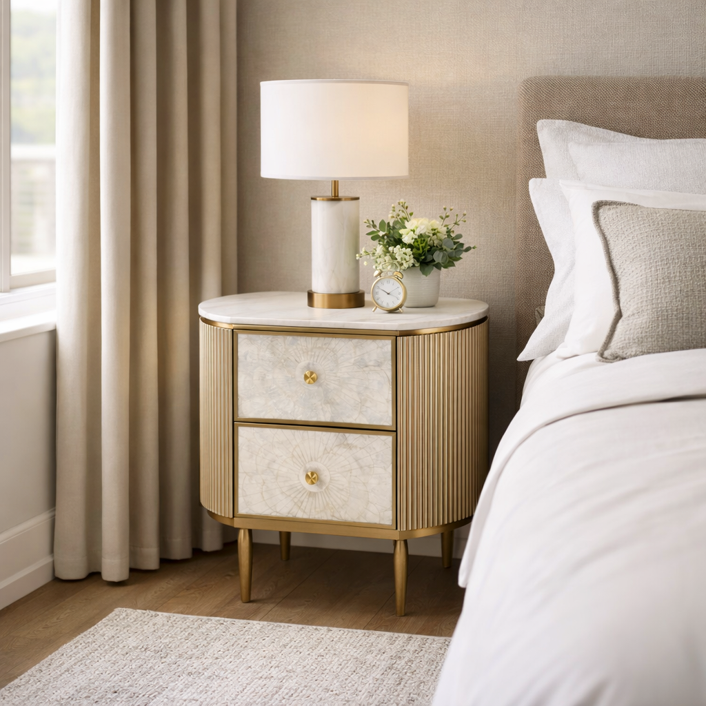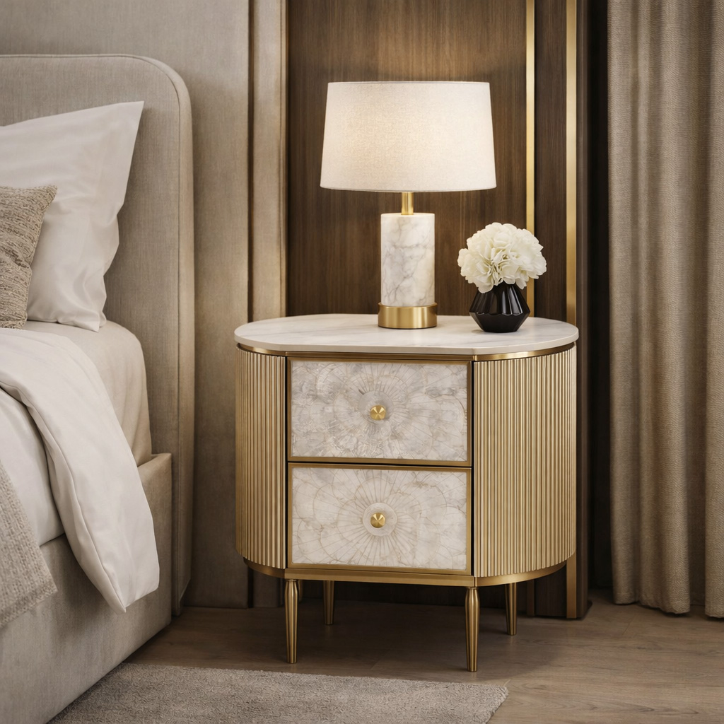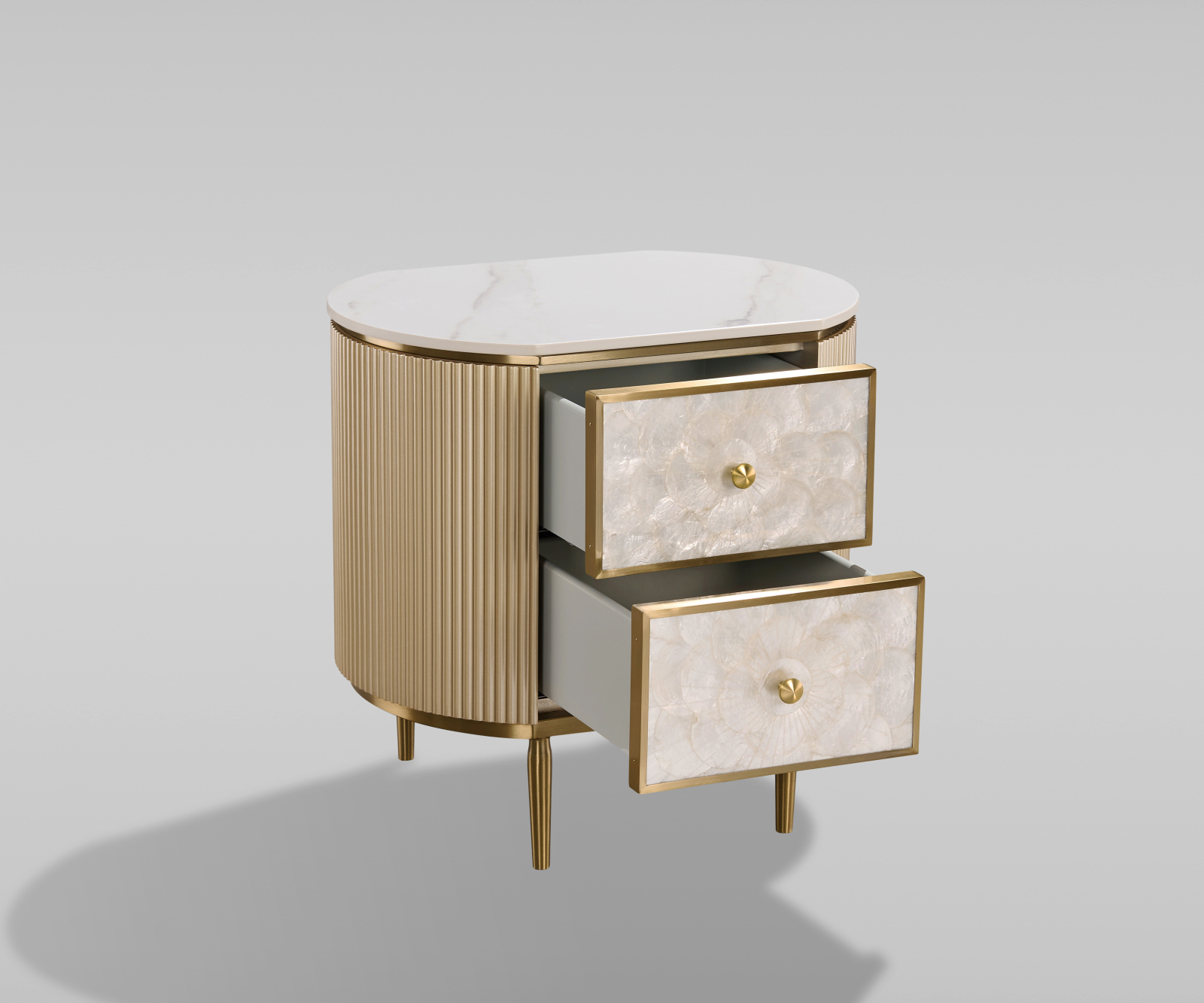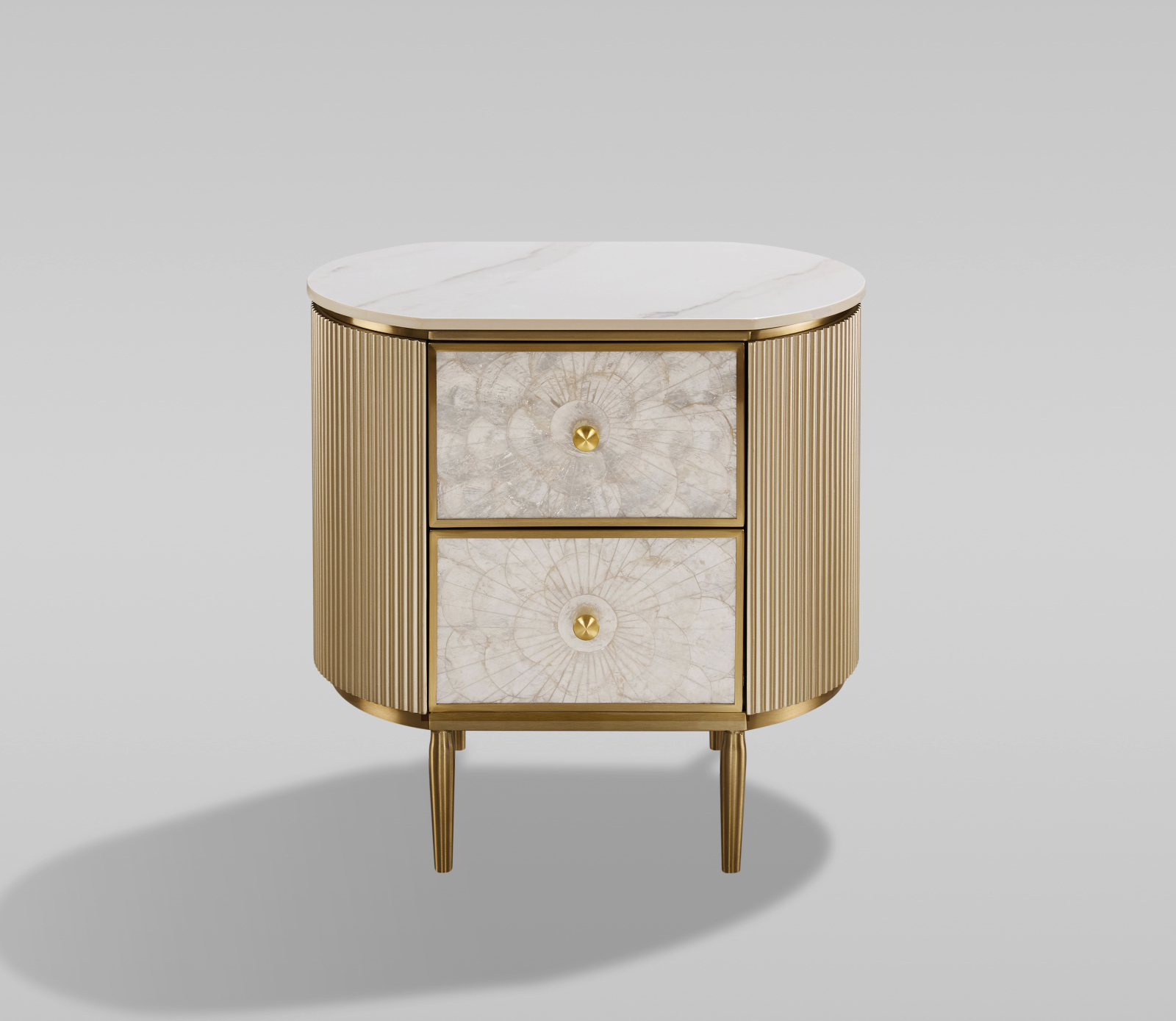 Această noptieră unică, de culoare auriu-șampanie, are o față realizată din scoică naturală într-un model simetric. Rama are caneluri din lemn și un blat cu finisaj de marmură.