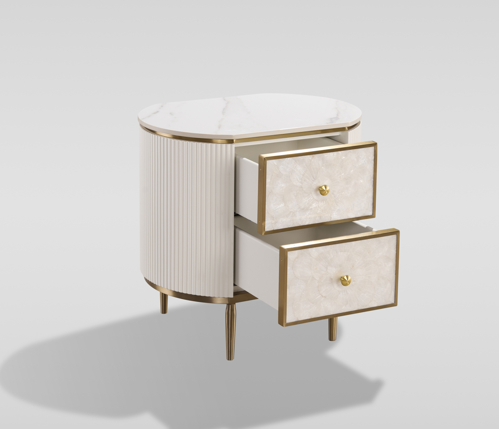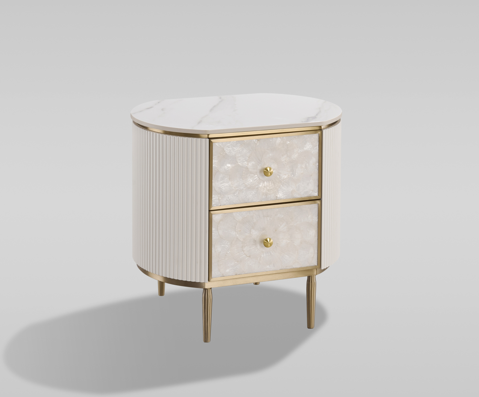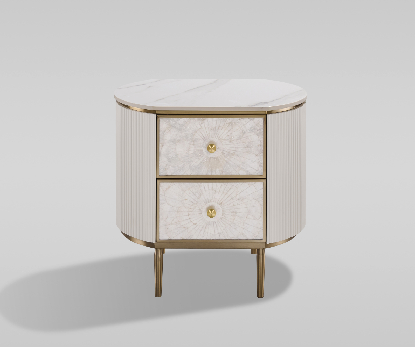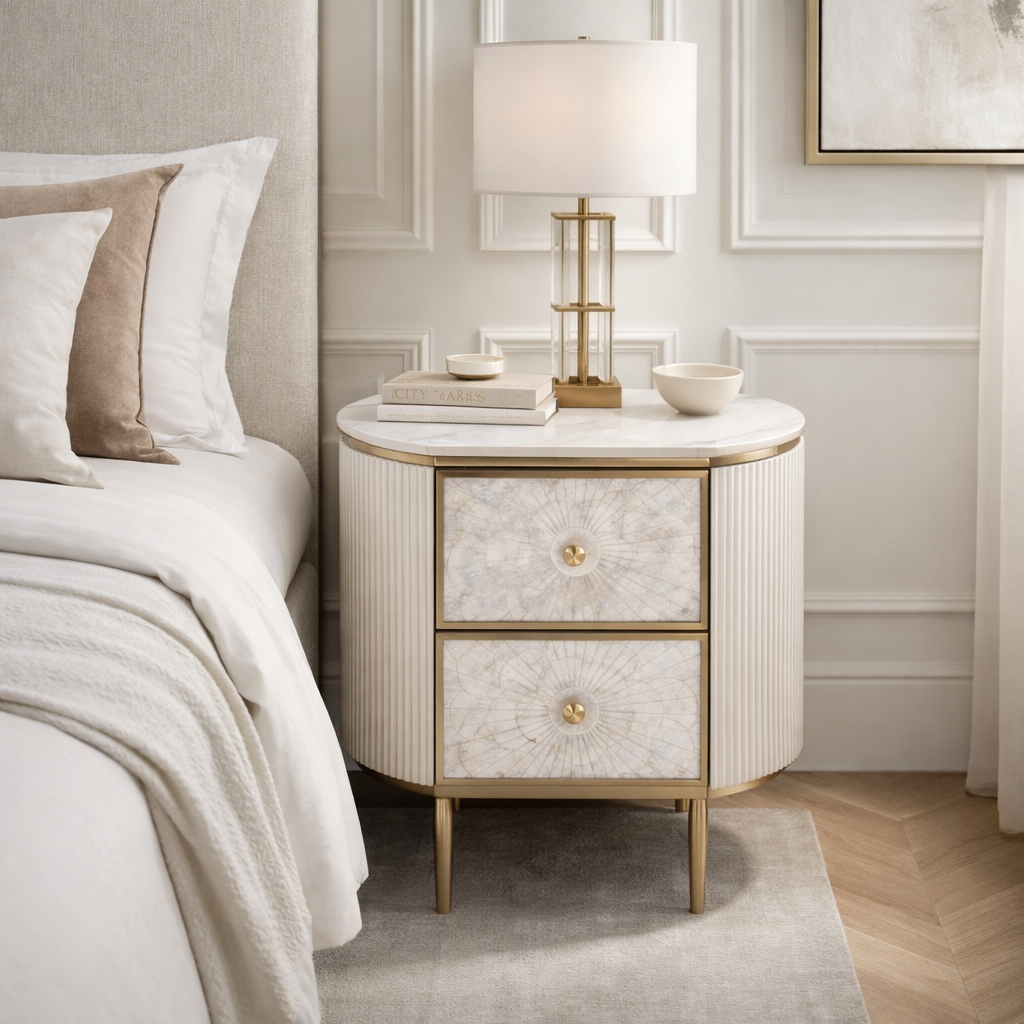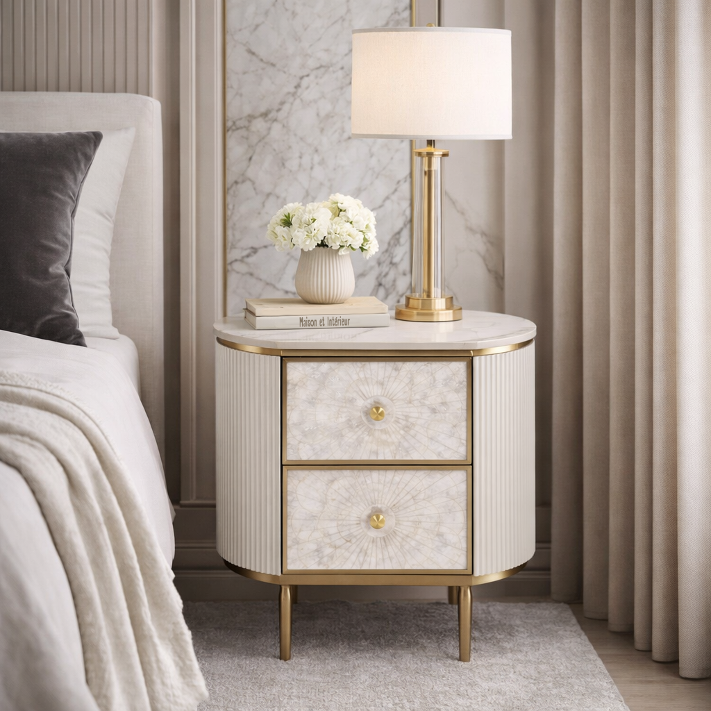 Această noptieră unică, de culoare alb-gălbui, are o față realizată din cochilie naturală într-un model simetric. Rama are caneluri din lemn și un blat cu finisaj de marmură.