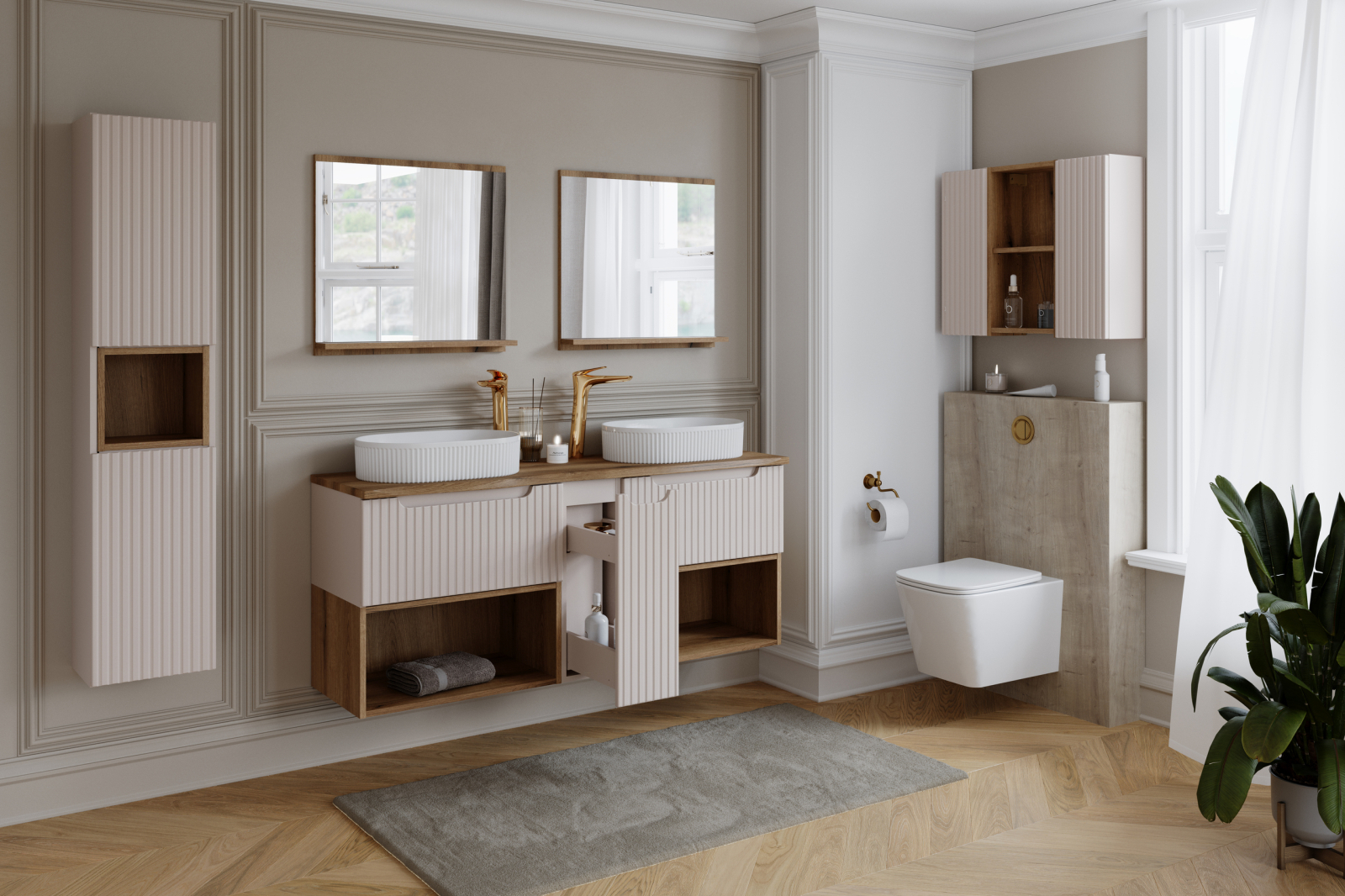Gama largă de elemente din cadrul colecției oferă posibilități de design aproape nelimitate – de la toalete mici și băi clasice până la spații mari, multifuncționale. Nova Cashmere este prima colecție din gama noastră care vă permite să creați o spălătorie dedicată, cu spațiu pentru o mașină de spălat, coșuri de rufe și spațiu de depozitare suplimentar.