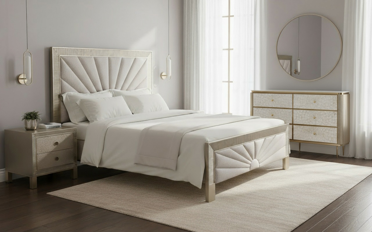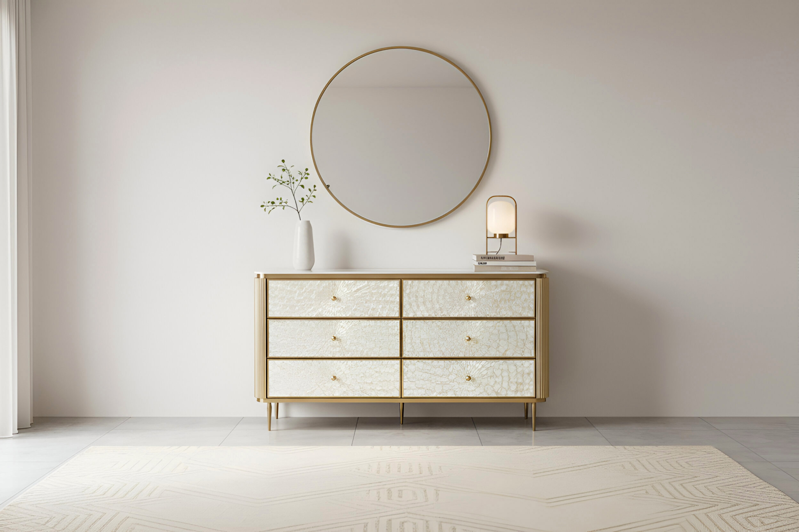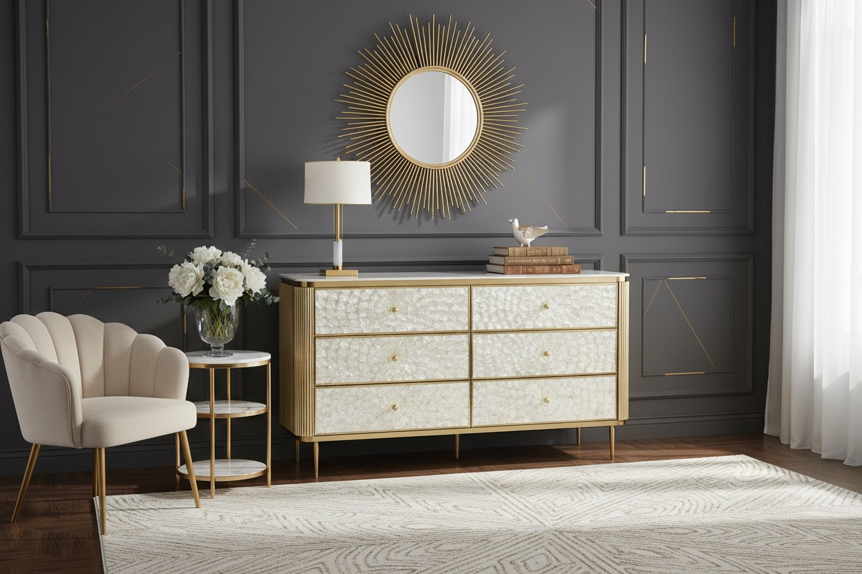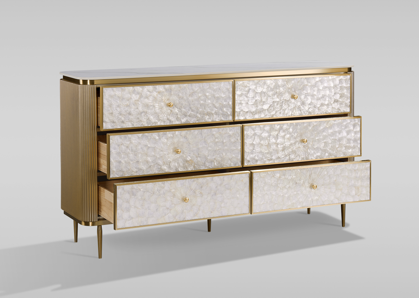 Această comodă unică are sertare aurii șampanie și fronturi realizate din scoici naturale într-un model simetric. Corpul are lemn canelat și un blat cu finisaj marmorat.
