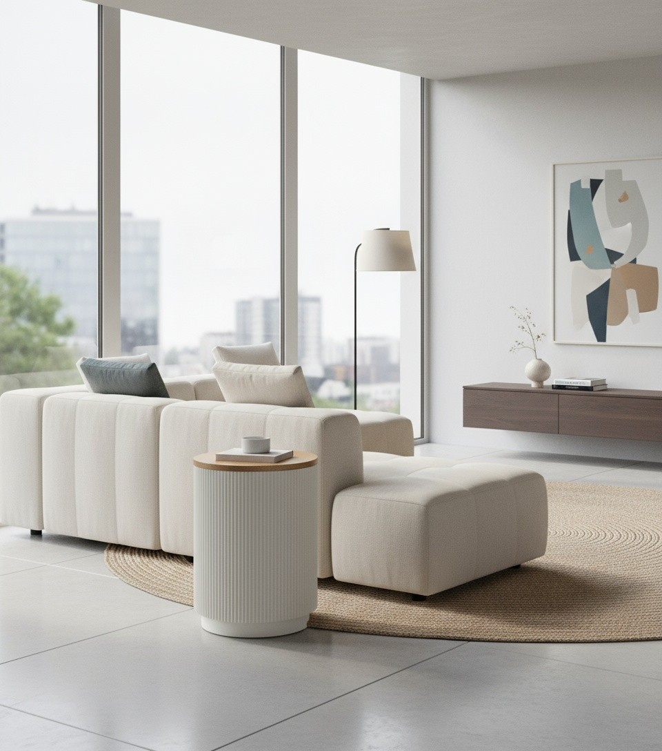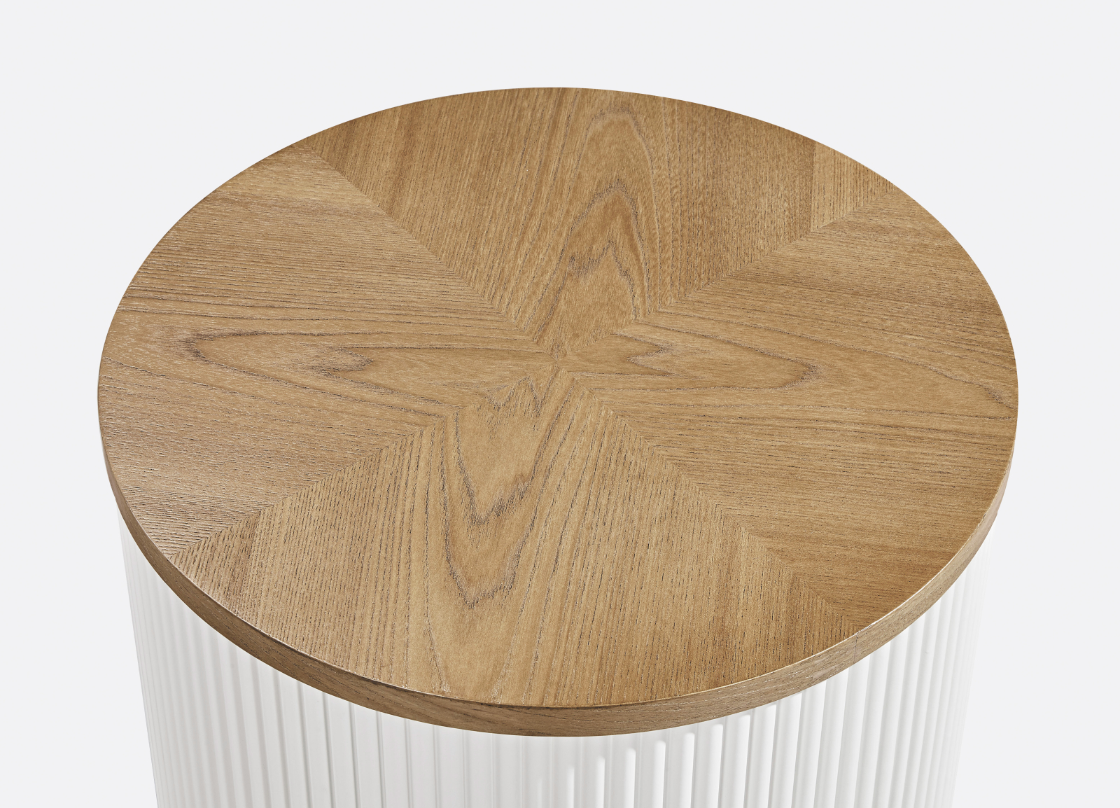 O masă minimalistă în alb și ecru. Cadrul este prevăzut cu lemn canelat. Blatul rotund este acoperit cu furnir texturat de ulm.